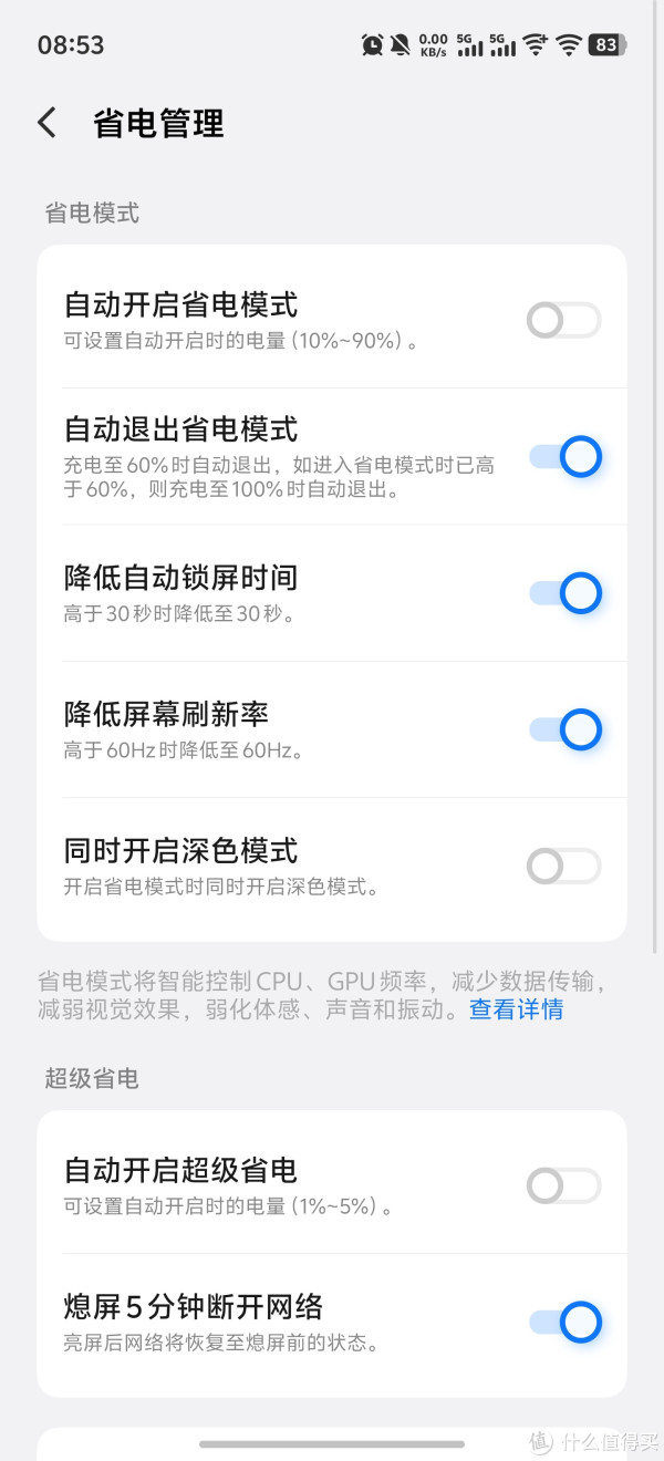 它的省电模式也很实用,晚上睡前开启超级省电,只保留通话和短信功能,一整晚掉电才1%。平时出门前开普通省电模式,系统会自动限制后台应用,还能智能调节屏幕刷新率,既不影响正常使用,又能多撑好几个小时,日常使用真的太省心了