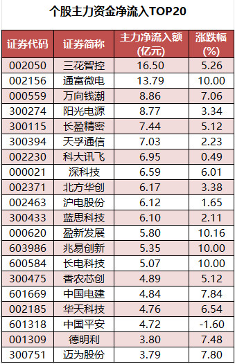 个股来看,今日有2450只个股获主力资金净流入,其中,163股获主力资金净流入超1亿元。三花智控主力资金净流入最多,净流入金额为16.5亿元;主力资金净流入居前的个股还有通富微电、万向钱潮、阳光电源、长盈精密、天孚通信等,净流入金额分别为13.79亿元、8.86亿元、8.77亿元、7.44亿元、7.03亿元。