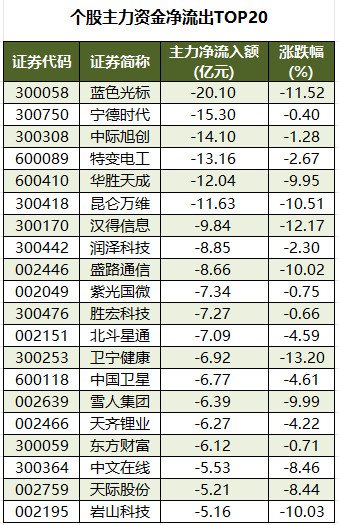 今日有2721只个股被主力资金净卖出,其中,201股被主力资金净卖出超1亿元。主力资金净流出最多的个股是蓝色光标,净流出金额为20.1亿元;主力资金净流出居前的个股还有宁德时代、中际旭创、特变电工、华胜天成、昆仑万维等股,净流出金额分别为15.3亿元、14.1亿元、13.16亿元、12.04亿元、11.63亿元。