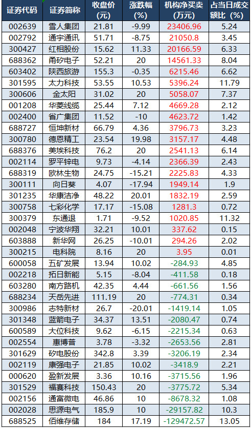 盘后龙虎榜数据显示,今日机构席位资金合计净卖出约6.6亿元。其中,净买入的个股21只,净卖出的个股15只。机构净买入最多的股票是雪人集团,净买入金额约2.34亿元;机构净买入居前的还有通宇通讯、红相股份、甬矽电子等股。机构净卖出最多的股票是佰维存储,净卖出金额约12.95亿元;机构净卖出居前的还有思源电气、通富微电、福赛科技等股。